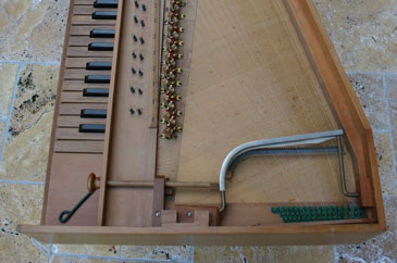 Disposition: ein Register (8'); Holzspringer mit schwerer unterer Messing-Pilote (unten in Pfannenlager auf Tastenhebel geführt, oben in gestanzten, zweifach geschraubten Einzelmessing-Rechen), Lederkiele; doppelte Filzdämpfer an in der Höhe justierbarem Messingträger; Lauten"zug" mittels Drehknopf (rechts in Vorsatzbrett) vertikal zu bewegen; vorder- und linksstimmig; vertikal gespiegelt J-förmiger Klangsteg, parallel zu diesem Lautenzug (Wirkung also nicht nahe dem Anzupfpunkt, wie sonst üblich, sondern am Klangsteg!). Basswandleiste im Bereich des Resonanzbodens beim Klangsteg ausgespart. Bezug vom Bass zum Diskant zunehmend strahlenförmig auseinanderlaufend. Das Instrument weist die spinett-typische ganztönig alternierende Anordnung von Springer- und Saitenpaaren auf. Tiefste Basssaite hinten im Instrument, somit typische "Spinett-Bauweise" ("geschwenktes Cembalo"; im Gegensatz zur Virginal, Clavichord- und überwiegenden Tafelklavierbauweise [Sonderfälle siehe dort!], bei der die tiefste Saite vorne im Instrument liegt).